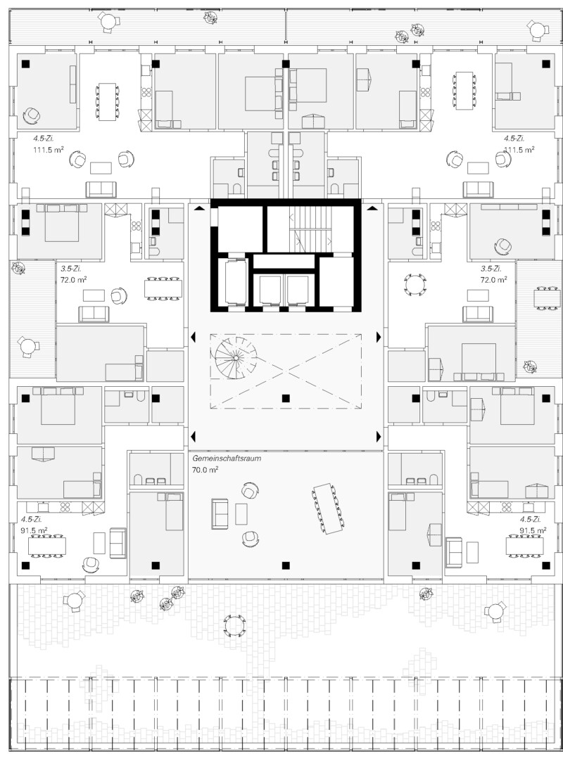 Die Projektverfassenden des Projektbeitrags haben einen auf vielen Ebenen sorgfältig ausgearbeiteten und qualitätsvollen Entwurf gestaltet, was sich vor allem in den dargestellten Grundrissen und der Strukturierung der drei unterschiedlich konzipierten Gebäudetypen zeigt. Die Idee der Adressbildung der einzelnen Häuser über zentrale Zonen als innenliegende Strassen oder Foyers wird ebenso gewürdigt wie die klare Haltung zu einer breiten Nutzungsverteilung und der Unterstützung von Diversität sowie Nachhaltigkeit. Mit der Entwicklung von Gebäudetypologien schaffen sie einen spannenden Ansatz zur Differenzierung der einzelnen Volumina, die jedoch zu wenig spezifisch ausgestaltet sind. Grundlegend fehlen dem Projekt innovative Ansätze und Gestaltungsideen, die über die aus dem Richtprojekt gewonnenen Erkenntnisse hinausreichen und einen wesentlichen Beitrag zur Weiterentwicklung des geplanten Stadtbausteins «Wankdorfcity 3» leisten könnten. Richtprojekt gewonnenen Erkenntnisse hinausreichen und einen wesentlichen Beitrag zu dem neu geplanten Stadtteil «Wankdorfcity 3» leisten könnten.